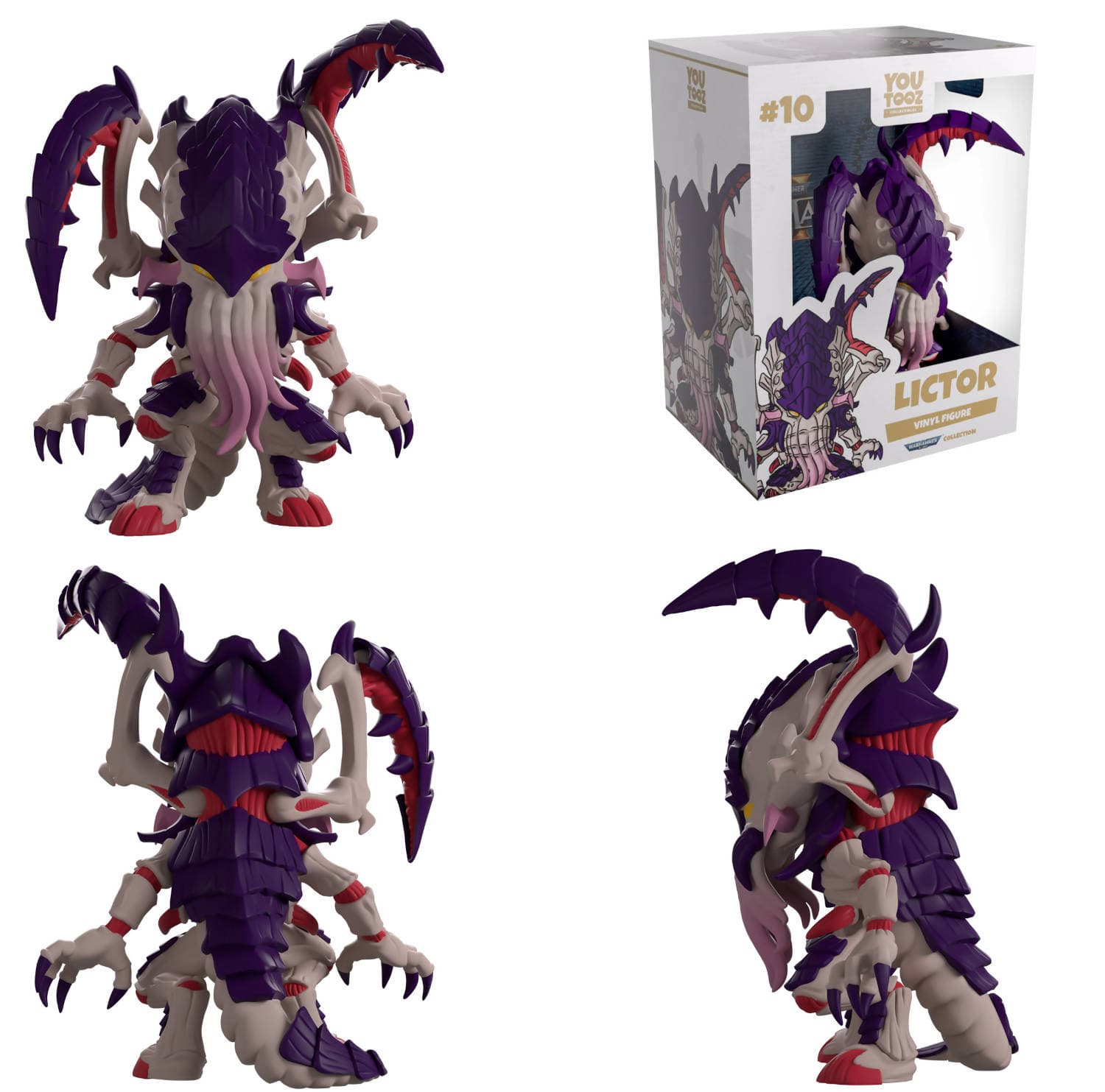 13-сантиметровый Ликтор выполнен с темными желтыми глазами, выглядывающими из-под темно-фиолетовых пластин, которые покрывают голову и спину, переходя в массивный закрученный хвост. С его морды свисают длинные щупальца с розовыми кончиками, подчеркивающие хищную натуру. Бледное костлявое тело пронизано темно-красными сухожилиями.