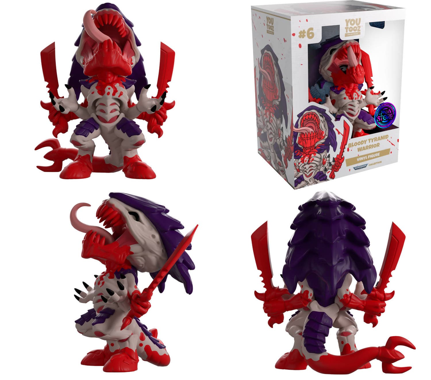 Фигурка Тиранида-воина высотой 10,7 см изображает монстра в атакующей позе с раскрытой пастью, из которой виднеются острые зубы и розовый язык, испачканный кровью. Голову серого цвета украшает выдающийся фиолетовый панцирь. Две из четырех рук сжимают окровавленные красные костяные мечи, а две другие вытянуты вперед.